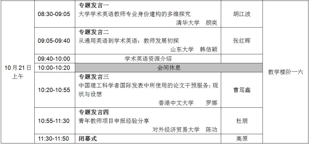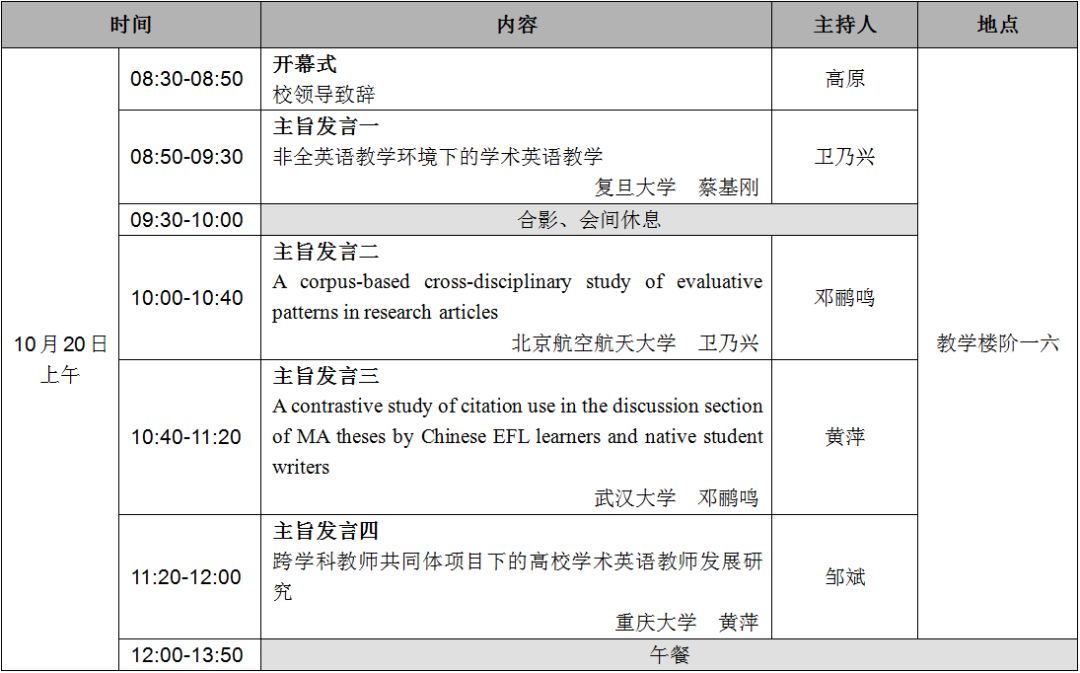 “第一届中国学术英语高端论坛”将于2018年10月20日至21日在北京召开。自论坛第1、2号通知发出后,得到了国内外从事学术英语教学及研究的专家、学者和骨干教师的积极响应。为促进参会代表们的深度交流,会议拟增设“圆桌论坛”议程,欢迎学界同仁携最新教学与学术成果参与讨论。若有意向参与,请将题目及摘要发送至邮箱:foreign@ucas.ac.cn,因席位有限,会务组将依据报名先后顺序确定发言人。 1 会议主题 大会主题:“学术英语本地化探索: 问题与对策” 分议题:学术英语教学、学术英语测评、学术英语研究、学术英语论文发表 2 会议信息 会议日期:2018年10月20—21日 会议地点:中国科学院大学玉泉路校区教学楼阶一六(地铁1号线玉泉路站附近) 报到信息:10月19日14:00-19:00(人文楼二层会议室);10月20日07:00-08:00(教学楼阶梯教室大厅) 3 基本信息 主办:中国科学院大学外语系 协办:中国学术英语教学研究会、外语教学与研究出版社、国脉(北京)科技有限公司 专家论坛: 蔡基刚教授 复旦大学 卫乃兴教授 北京航空航天大学 方志辉教授 佛罗里达大学 邓鹂鸣教授 武汉大学 黄 萍教授 重庆大学 周长银教授 北京第二外国语学院 高 原教授 中国科学院大学 邹斌副教授 西交利物浦大学 青年学者论坛: 颜奕副教授 清华大学 陈功副教授 对外经济贸易大学 韩佶颖副教授 山东大学 罗 娜博士 香港中文大学 4 会议日程 5 会议报名 本次论坛不收取会务费,差旅及住宿请自行安排。 注册网站:https://www.wjx.top/m/28126826.aspx 截止日期:2018年10月10日,名额有限,额满即止。 ★ 所有参会人员须注册参会,待审核通过后,组委会将发出正式邀请函。 6 会务组联系方式 会议信息及常见问题咨询见博客https://2018beijing.edublogs.org/ 会议组委会 中国科学院大学外语系 2018年10月9日
